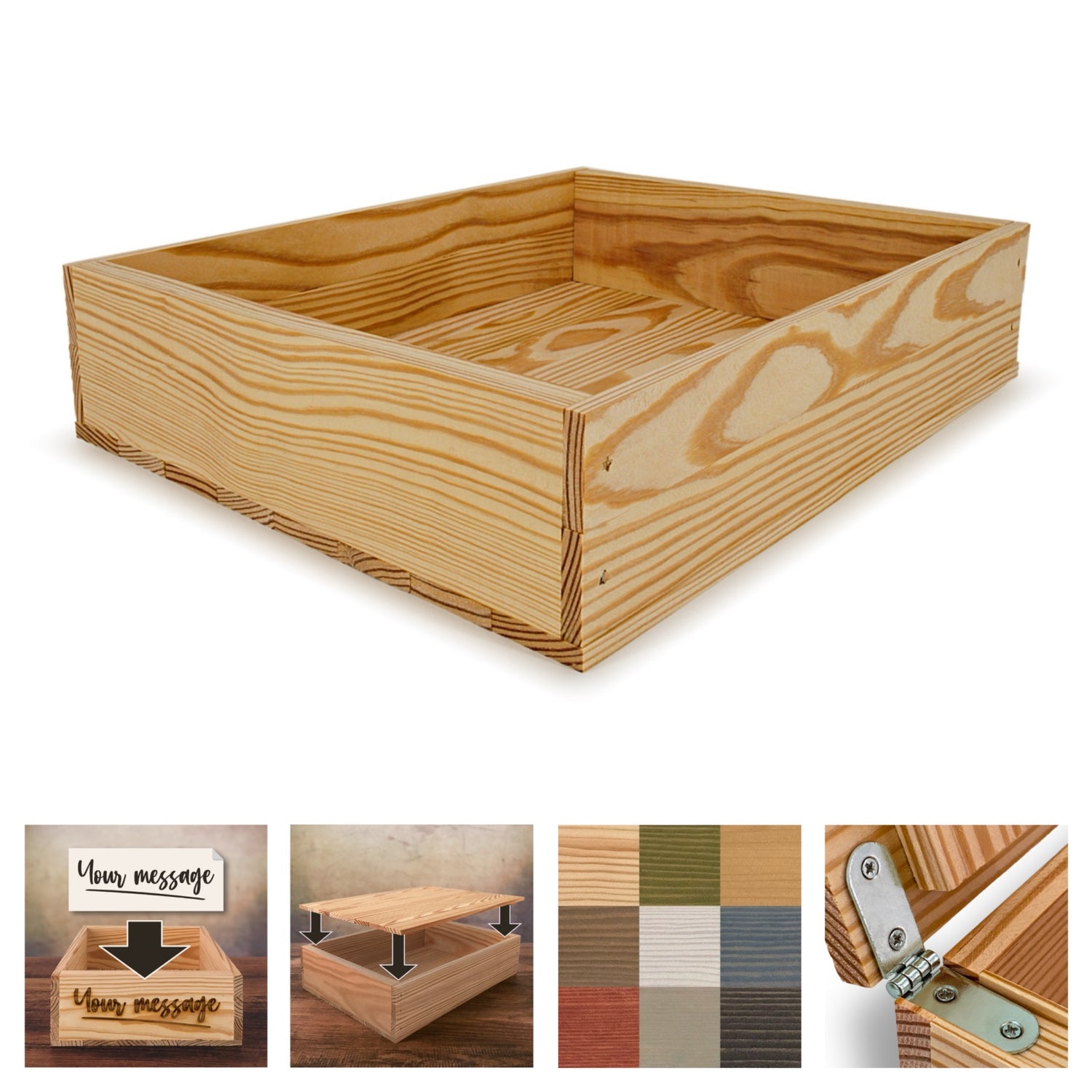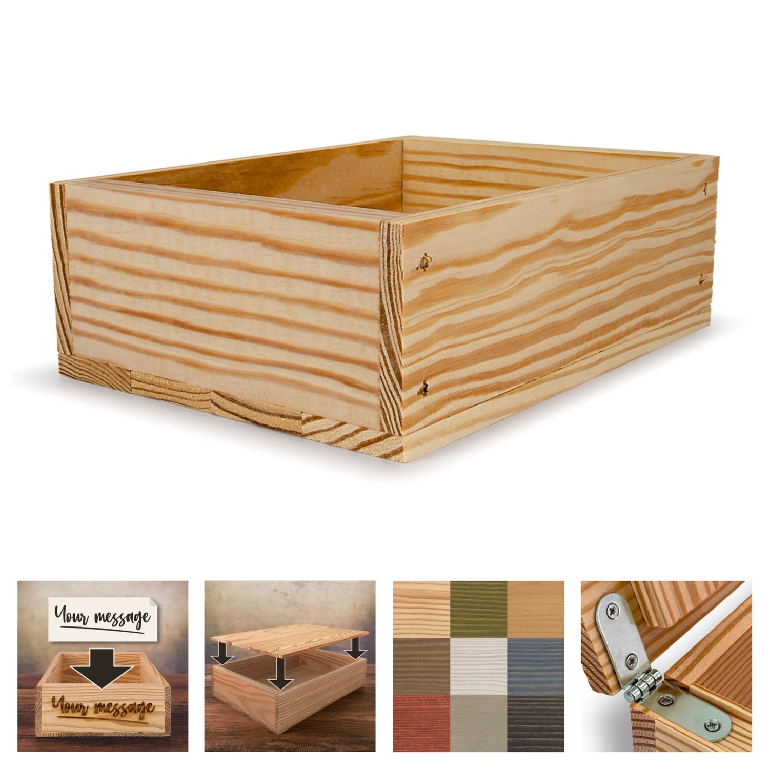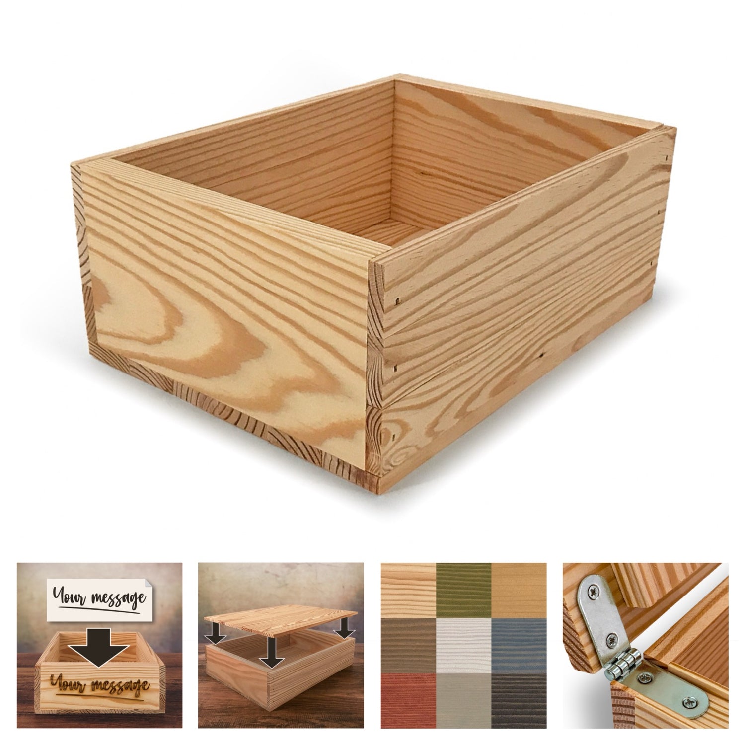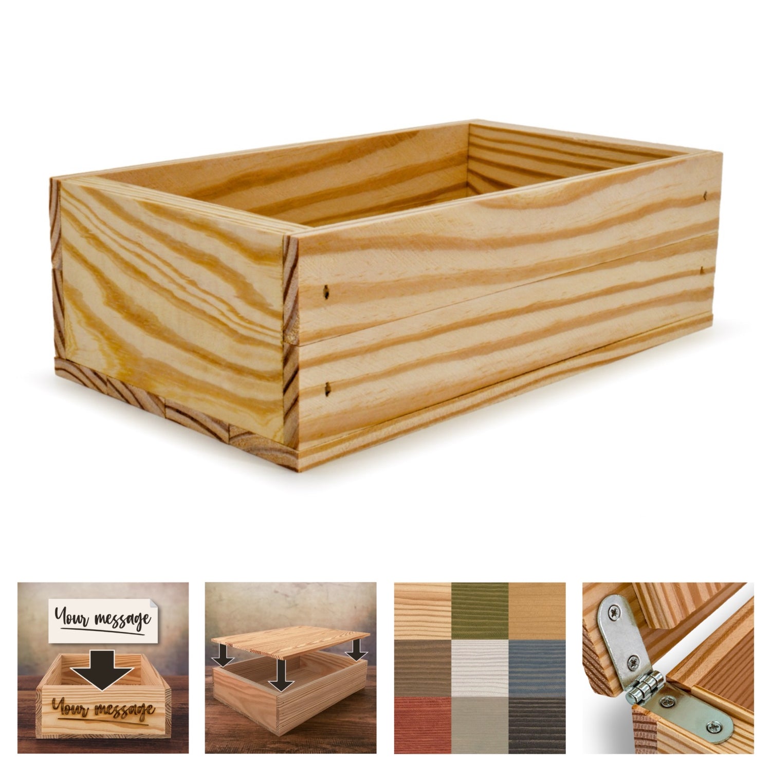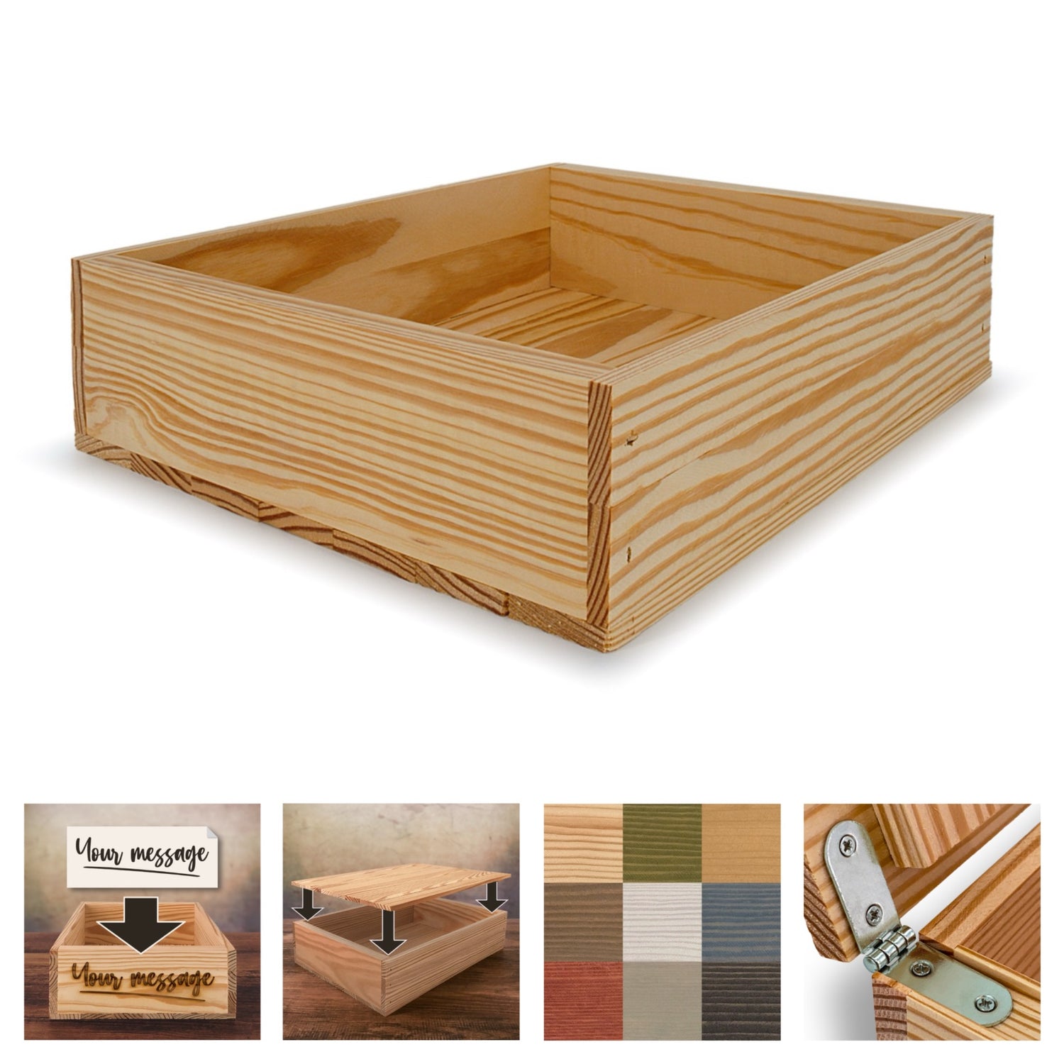 Discover handcrafted solid side box style wooden crates in various sizes. Ideal for gifts, packaging, storage, display, or decor. Customize with your message or logo. Made in the USA, durable and stylish, with optional lift-off lid.