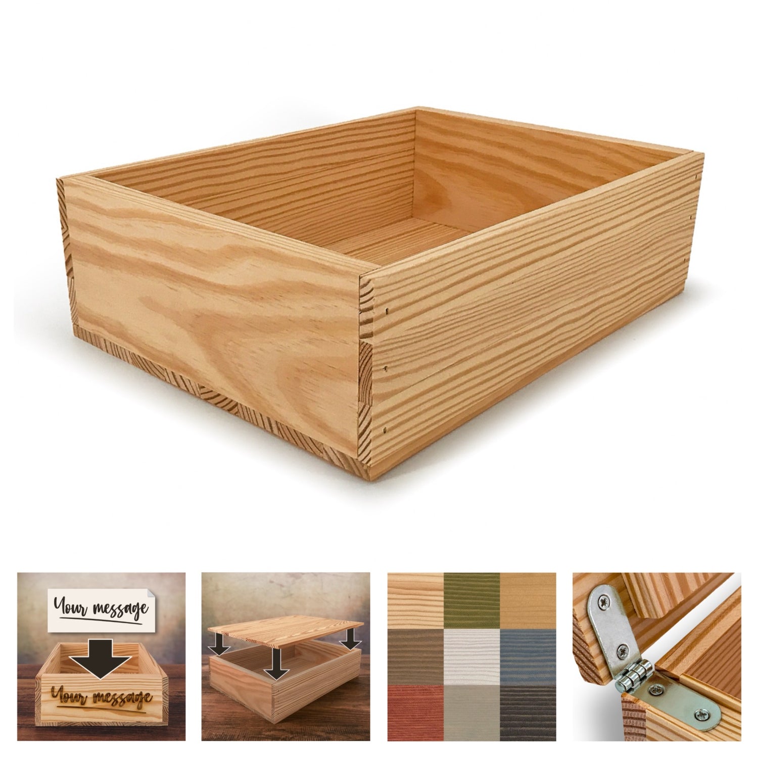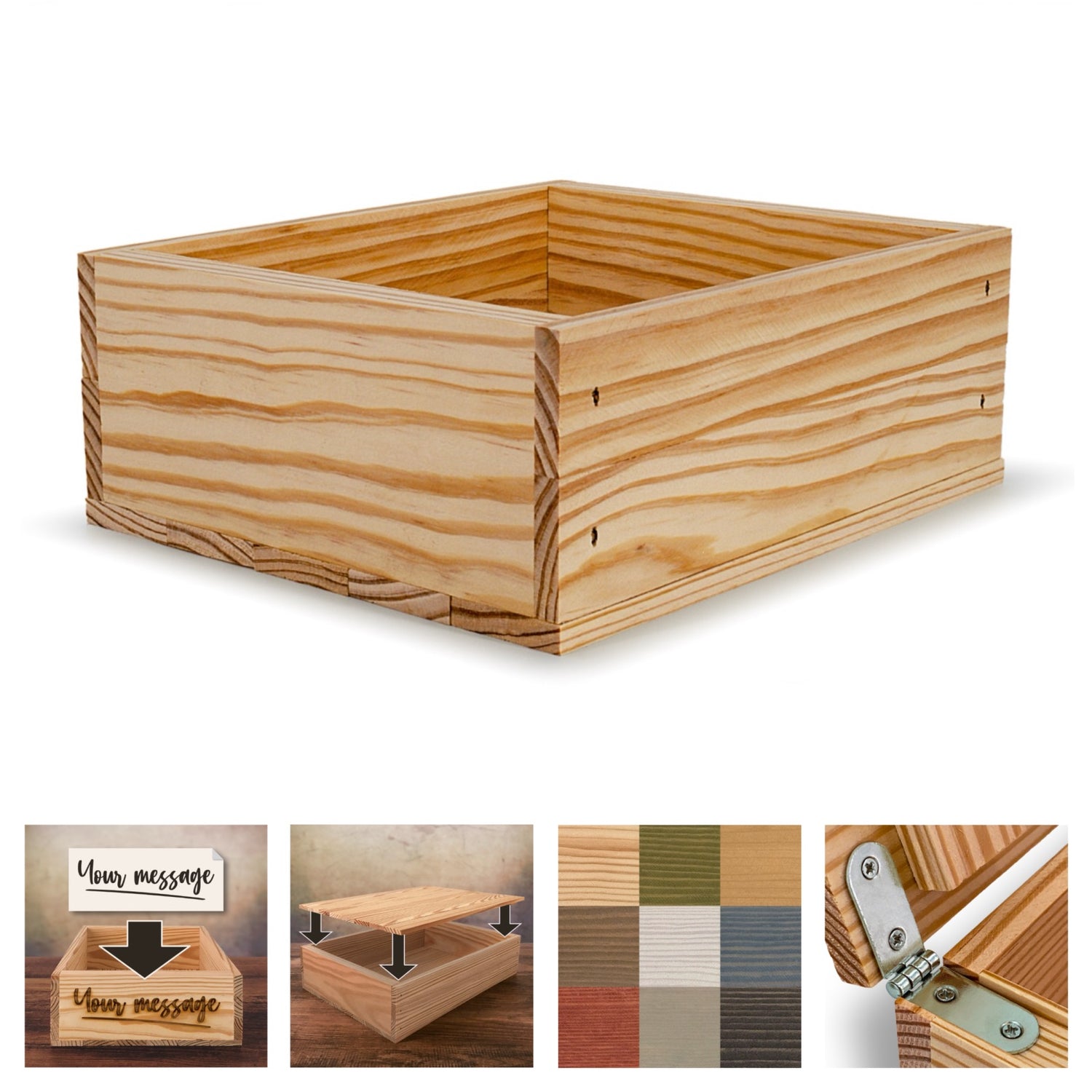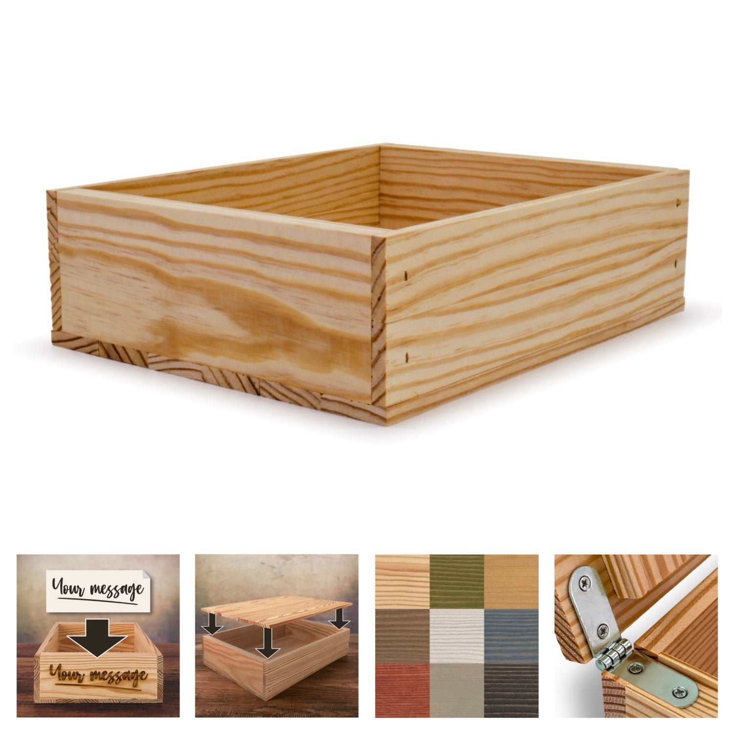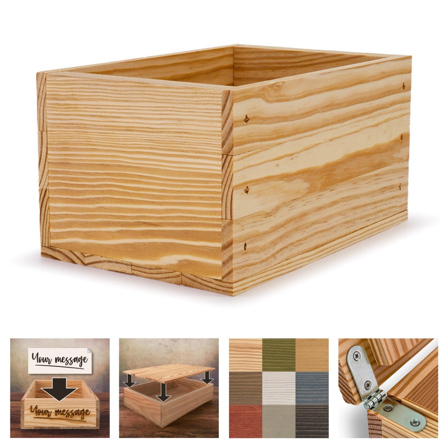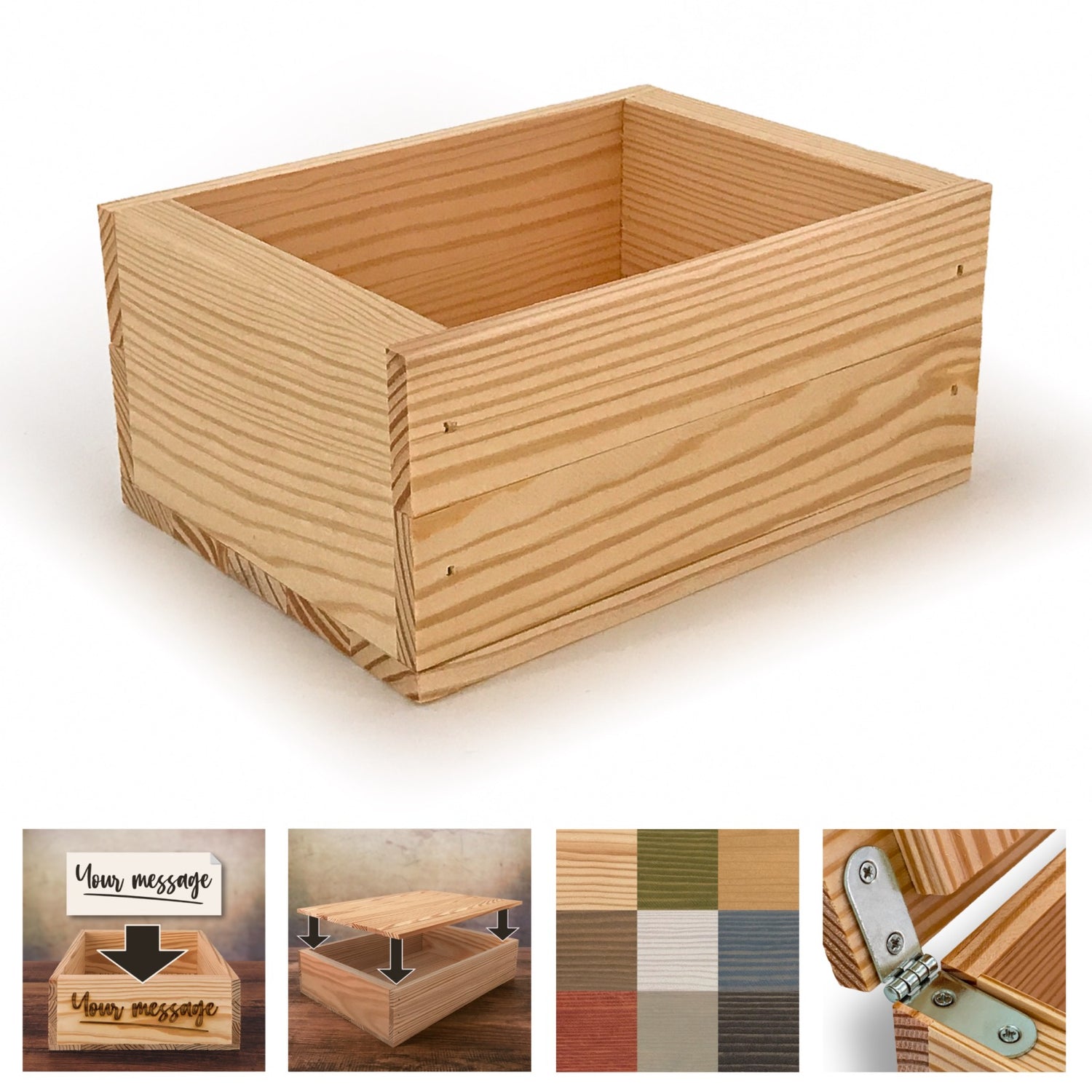 Discover handcrafted solid side box style wooden crates in various sizes. Ideal for gifts, packaging, storage, display, or decor. Customize with your message or logo. Made in the USA, durable and stylish, with optional lift-off lid.