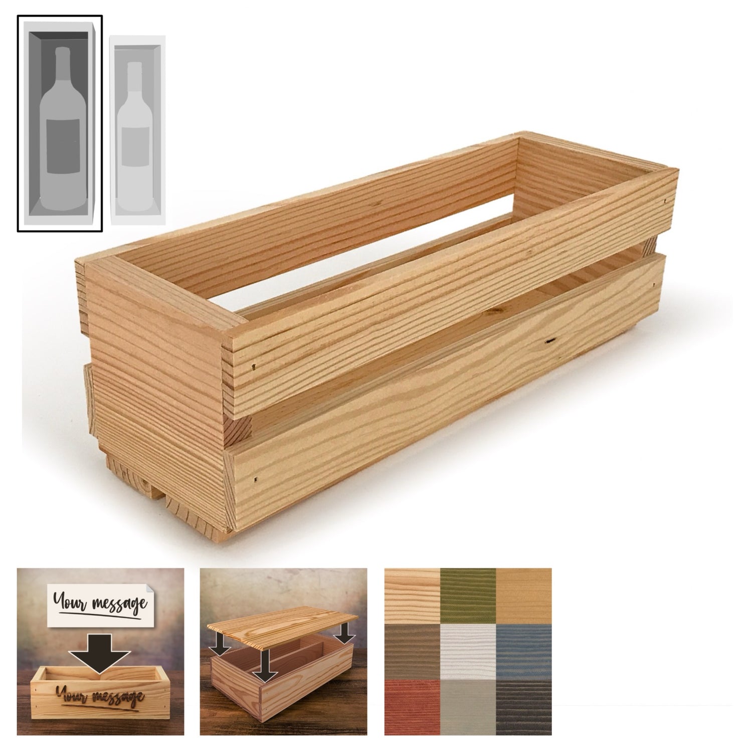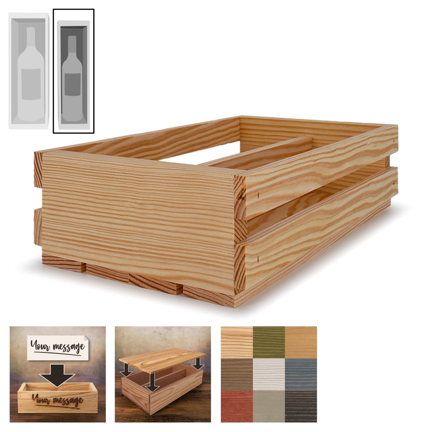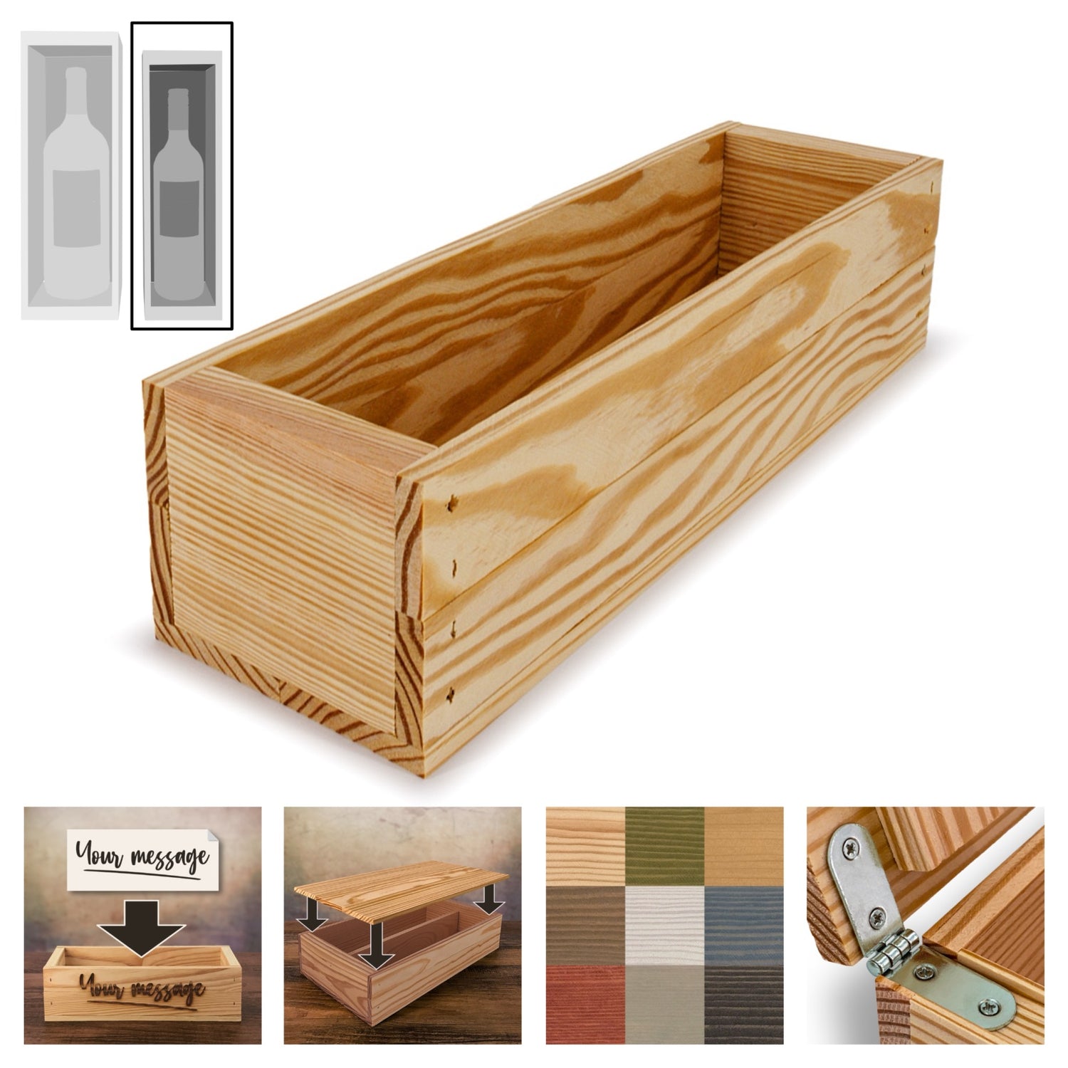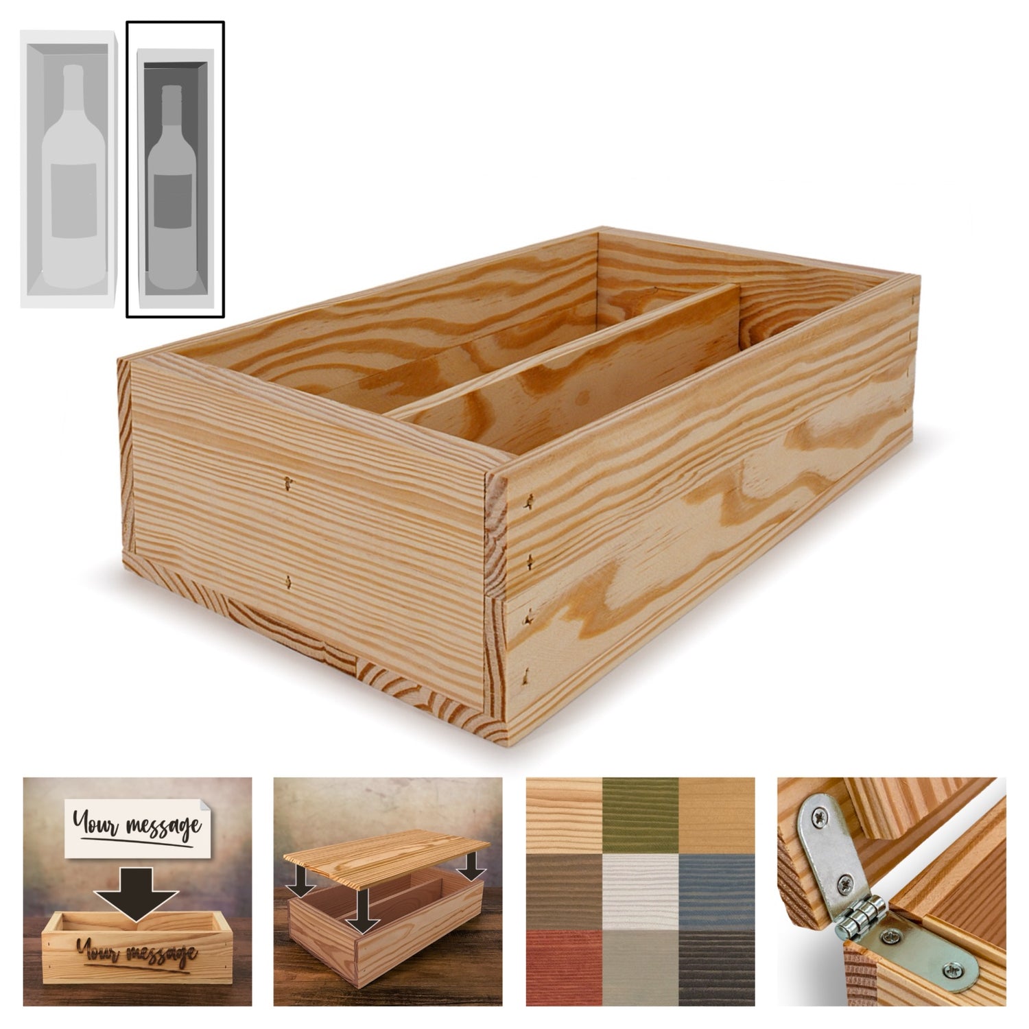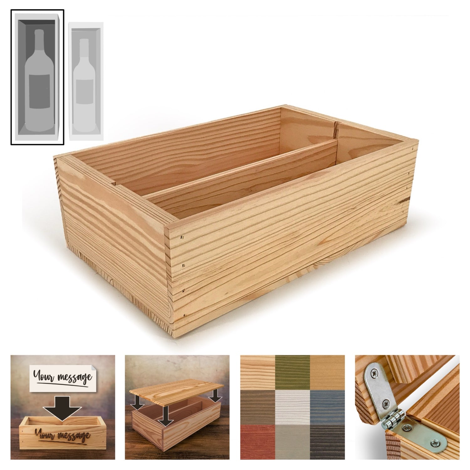 Explore elegant wooden wine bottle boxes, perfect for any occasion. Customize with your logo or message. Optional lift-off lid. Durable, stylish, USA-made for a personalized touch.